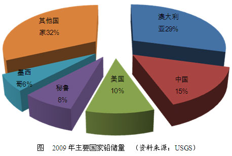 全球铅资源分布相对比较集中,主要分布在澳大利亚、北美、中国、中亚等国家和地区。2009年,前五位资源国的铅储量在世界总储量中占到68%。