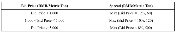 Non-FF Members, OSNBPs, and Clients may request for quote (“RFQ”) from market makers for all listed option contracts. An RFQ should specify the contract code, and RFQs for the same option contract should be spaced no less than 60 seconds apart. No RFQ may be submitted for a particular option contract when its best bid-ask spread is less than or equal to the spread shown in the table below.
