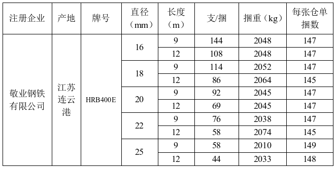 二、自公告之日起,上述产地生产的“敬业”牌螺纹钢可用于我所螺纹钢期货合约的履约交割。具体注册信息如下: