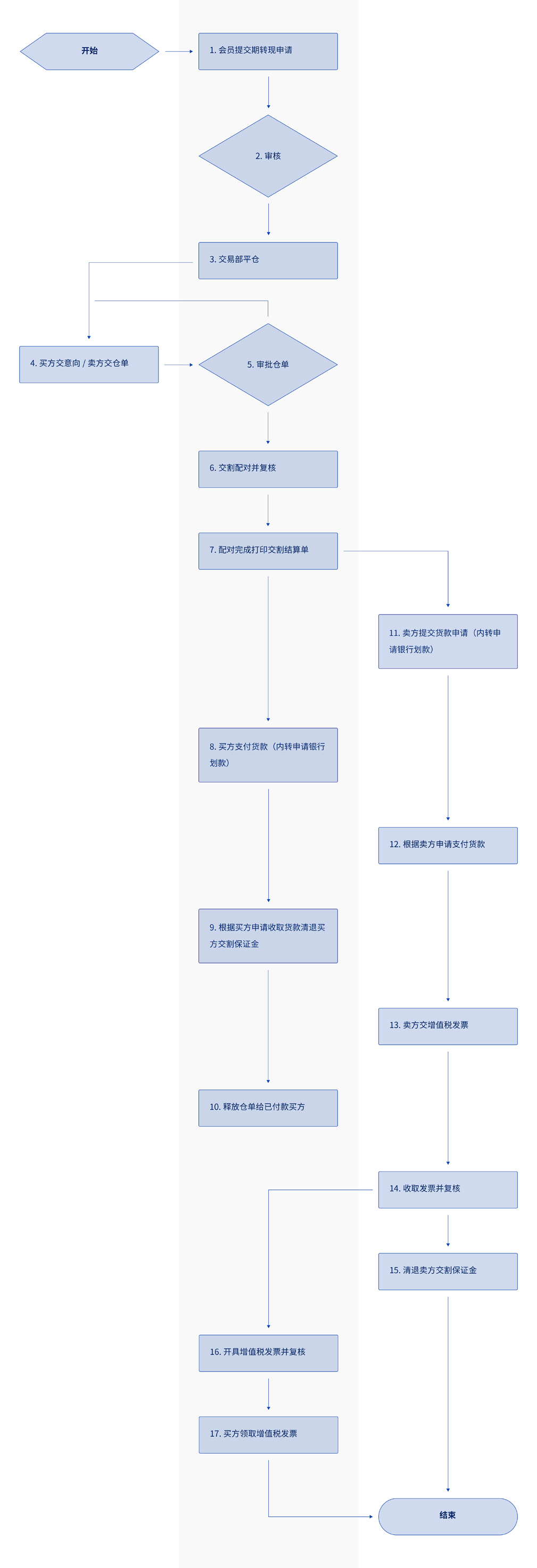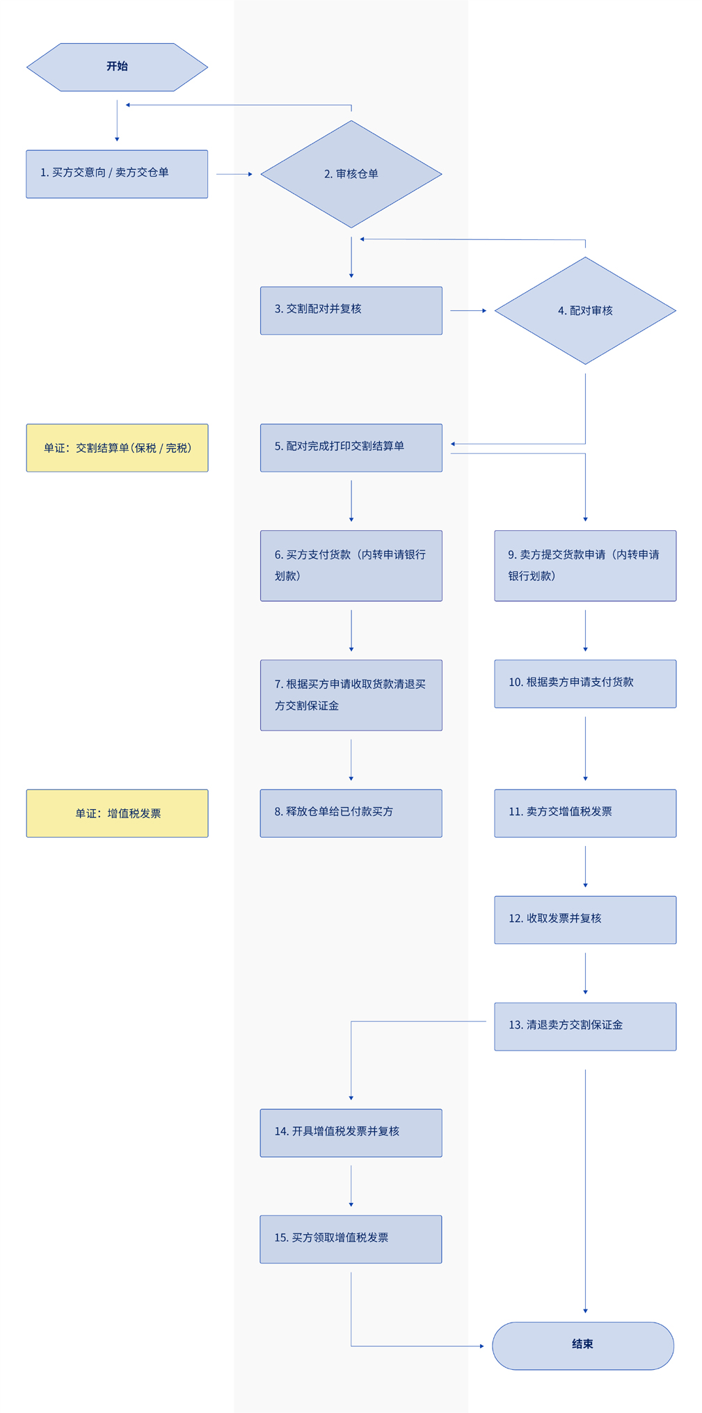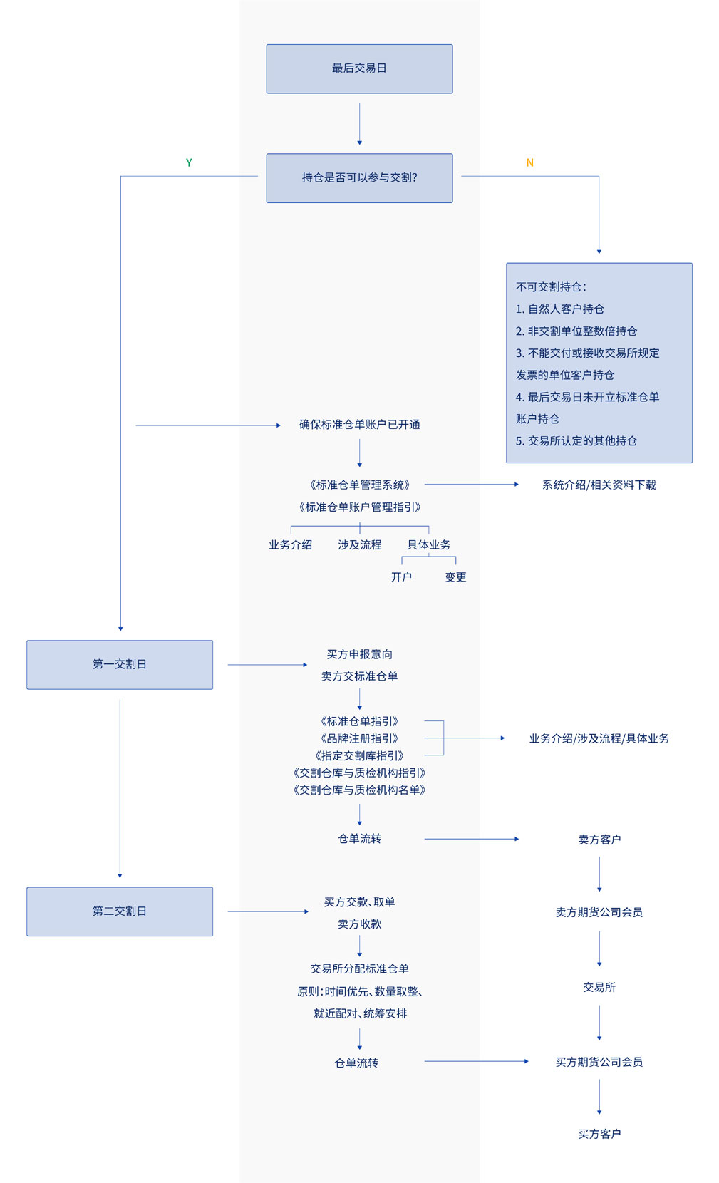 买方申报意向、卖方交标准仓单、交易所分配标准仓单、买方交款及取单、卖方收款。